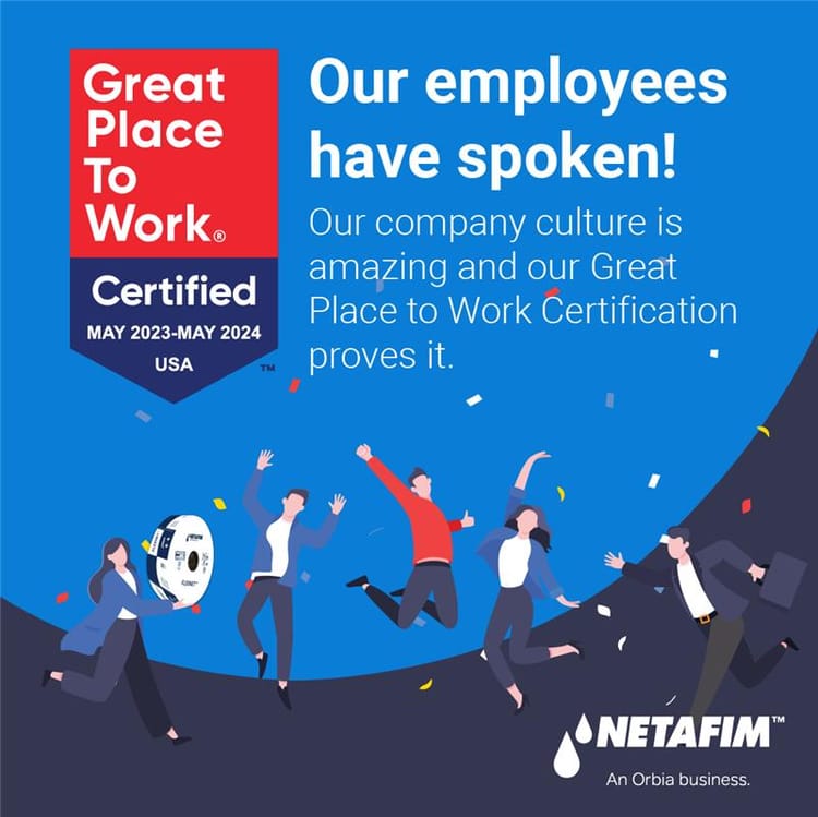 Our team is made up of farmers, manufacturers, innovators, professionals, and more who are committed to helping the world grow more with less. We are the leading precision irrigation company worldwide thanks to their hard work. Congratulations to our entire team for achieving this certification and helping to make Netafim USA a Great Place to Work!